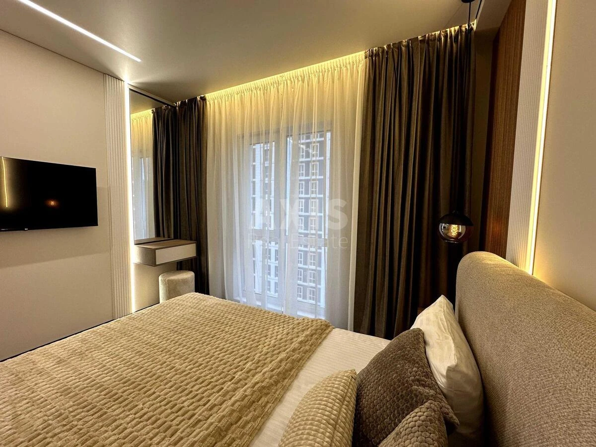 ЖК Нова Англія, 1 кімнатна квартира. Планування: кухня-вітальня, спальня, санвузол. В квартирі виконано якісний дизайнерський ремонт та встановлено техніку провідних світових брендів. Поруч з ЖК знаходяться найбільший в Україні ТРЦ Respublika Park, Сільпо, Епіцентр, ЖК Метропліс, Кришталеві Джерела, Паркленд, Parland, Республіка, Perfectown, Лікоград.