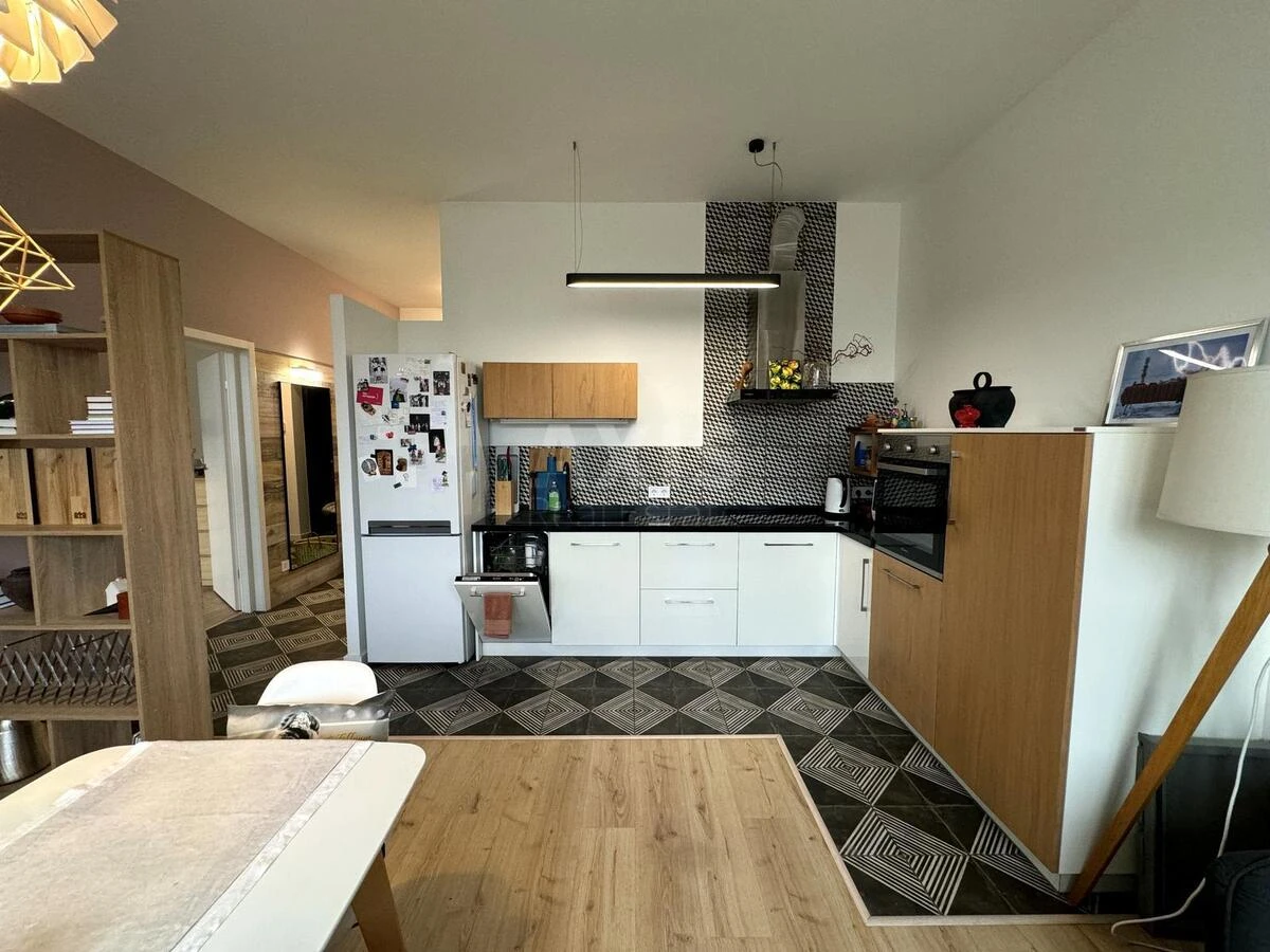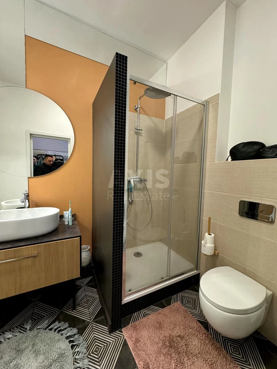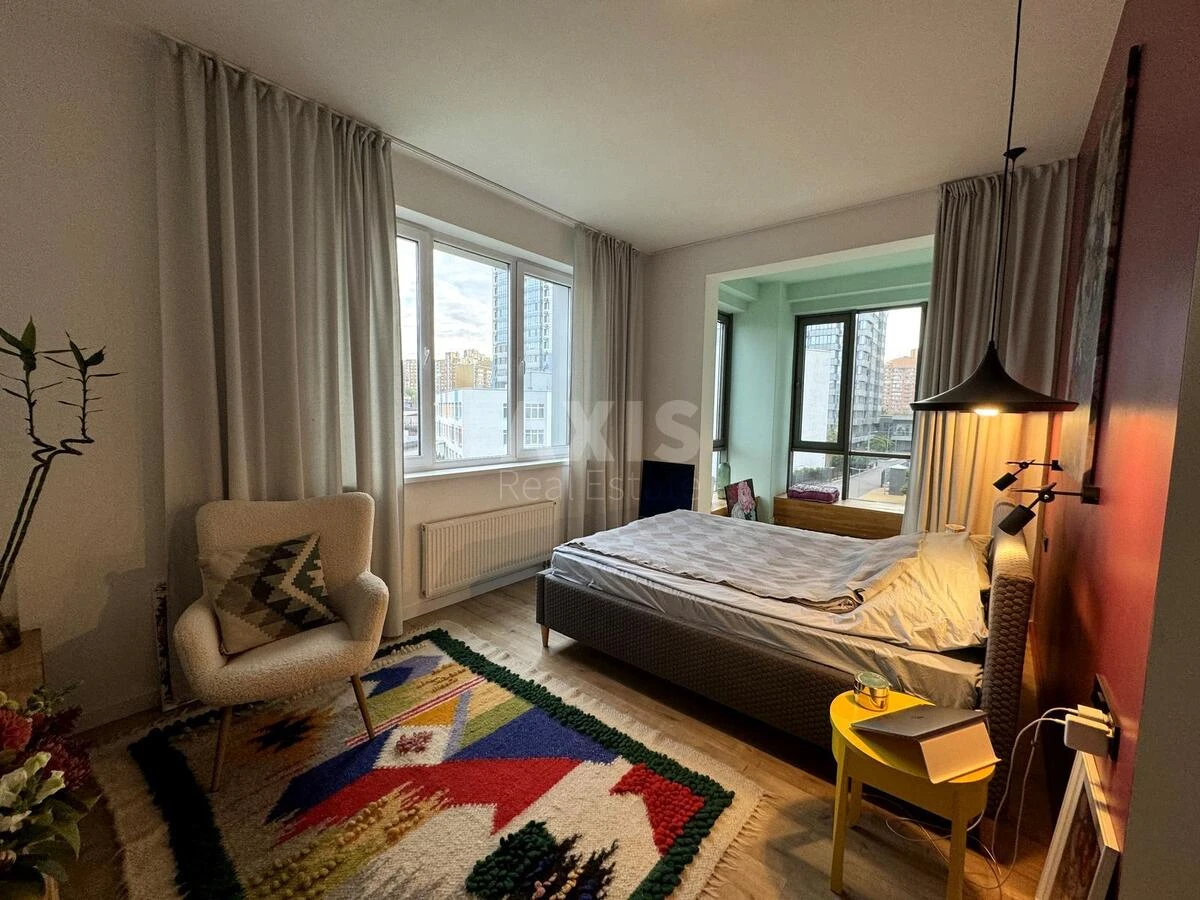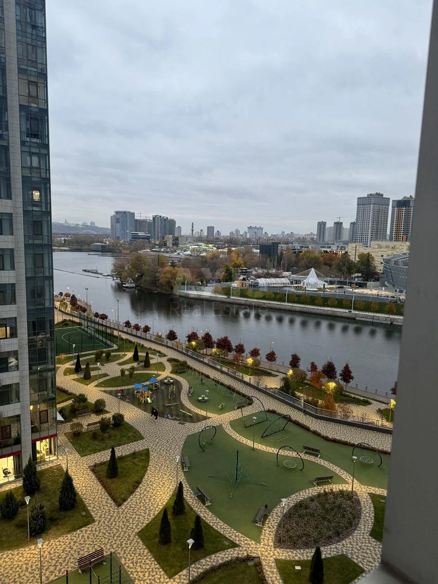 ЖК RiverStone, 1 кімнатна квартира. Спальня: панорамні вікна з видом на внутрішній двір, зручне ліжко, комод для білизни, затишний інтер’єр. Кухня-вітальня: простора, зі зручним диваном, оснащена всією необхідною технікою: посудомийна машина, духова шафа, варильна поверхня, кондиціонер. Санвузол: душова кабіна, бойлер, пральна машина. Гардеробна: простора кімната при вході. Вид з вікон: на затоку Дніпра, частково видно правий берег Києва, Києво-Печерську лавру та «Батьківщину-Мати».
