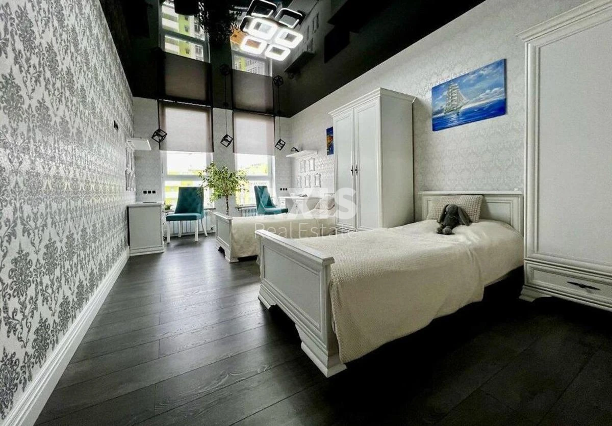 ЖК Нивки Парк, 3 кімнатна квартира. Елітна двоповерхова квартира в престижному житловому комплексі з охороною. Простора кухня-вітальня з великими панорамними вікнами наповнює оселю світлом та відкриває незабутній вид на місто. Центральним елементом гостьової є стильний камін, що створює атмосферу затишку й тепла. Високі стелі та панорамні вікна роблять кімнату ідеальною для сімейних вечорів біля вогню або зустрічей з друзями. На другий поверх ведуть авторські сходи з ясеню, з кованими перилами у вигляді нот, створеними за ескізами відомого американського дизайнера. На другому рівні розташовані затишна спальня в темних тонах та кабінет для роботи чи творчості, де продумане планування та сучасний дизайн сприяють максимальному комфорту. Також на другому поверсі є дитяча кімната, виконана в світлих пастельних відтінках, що створює спокійну атмосферу. Простора кімната наповнена природним світлом і ідеально підходить для ігор, навчання та відпочинку дитини. Житловий комплекс пропонує всі умови для комфортного та безпечного проживання: цілодобова охорона, відеоспостереження, власний паркінг, зелені зони для відпочинку. Район має зручне транспортне сполучення та багату інфраструктуру. Навколо є все необхідне для комфортного життя – магазини, кафе, парки та освітні заклади.