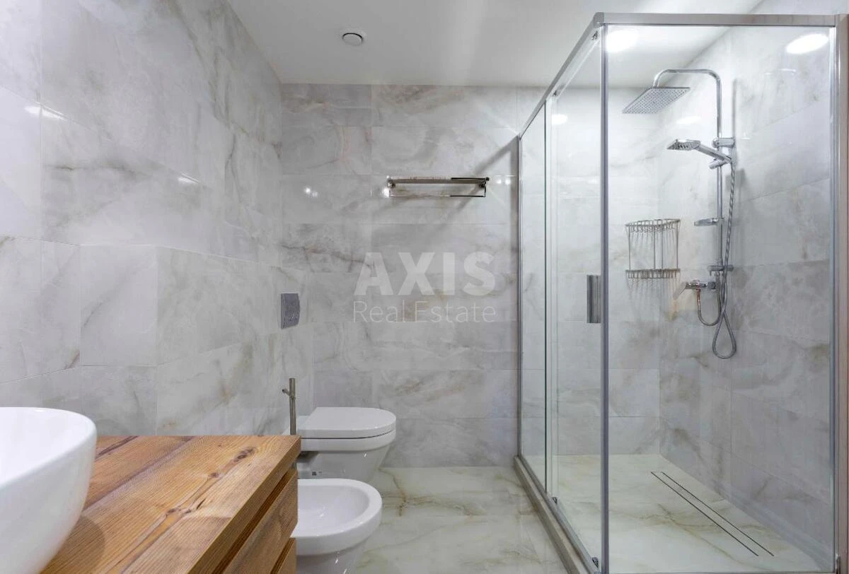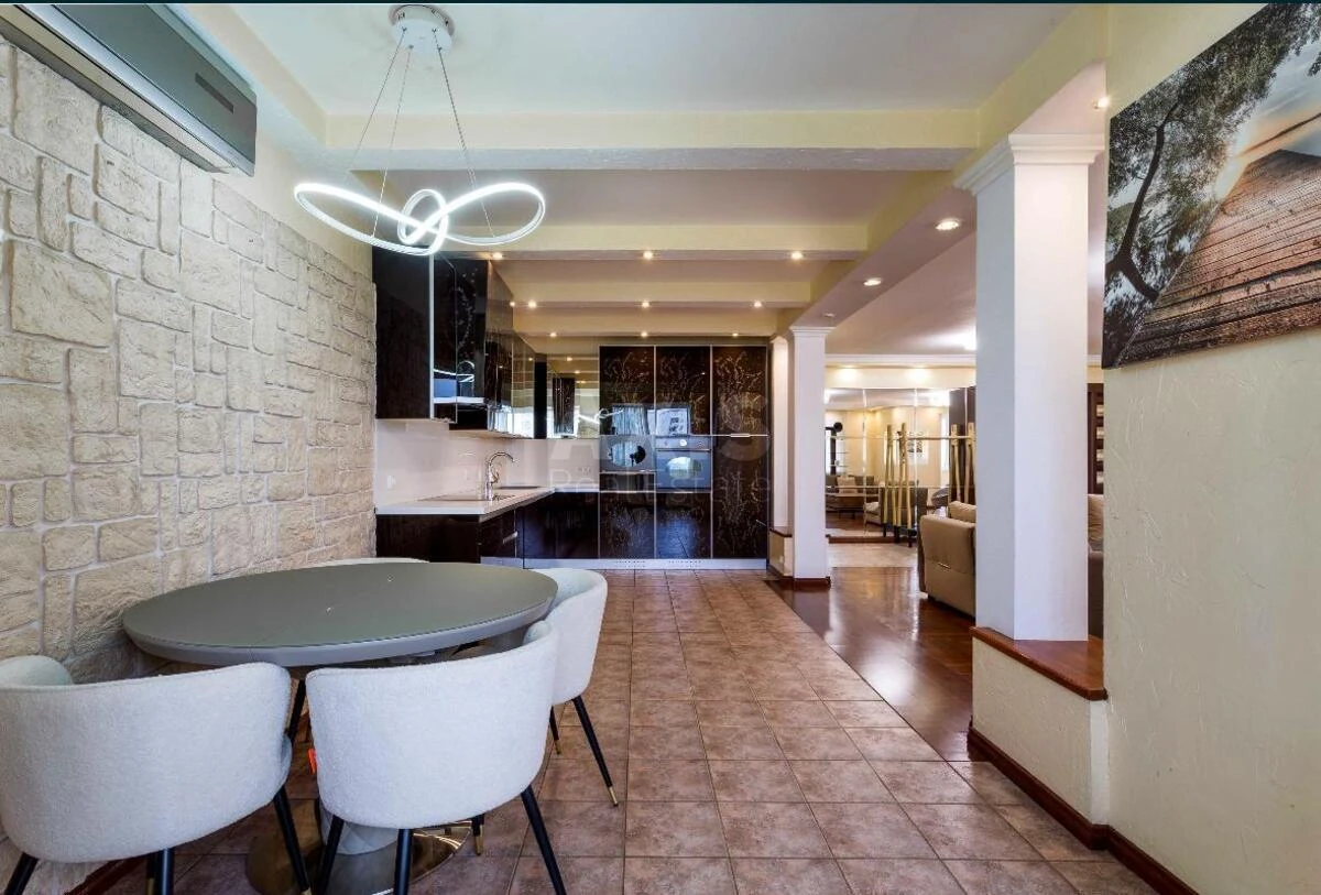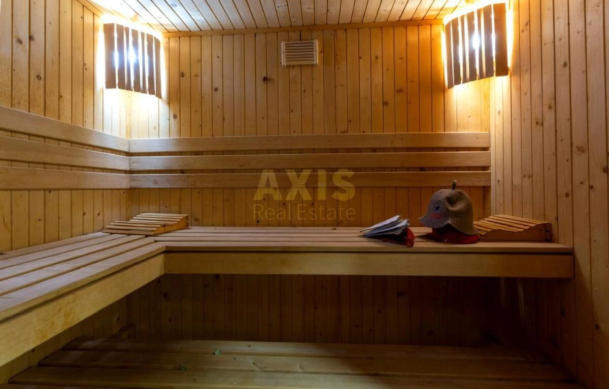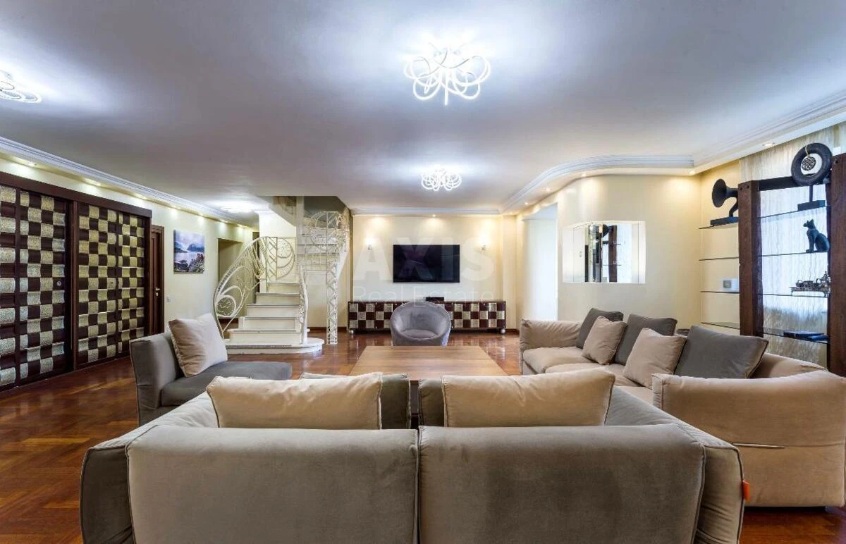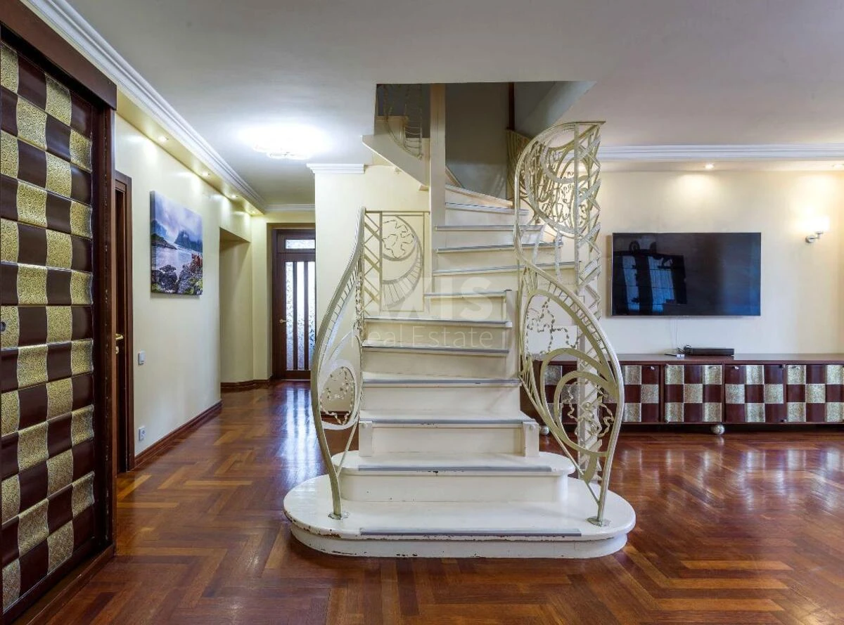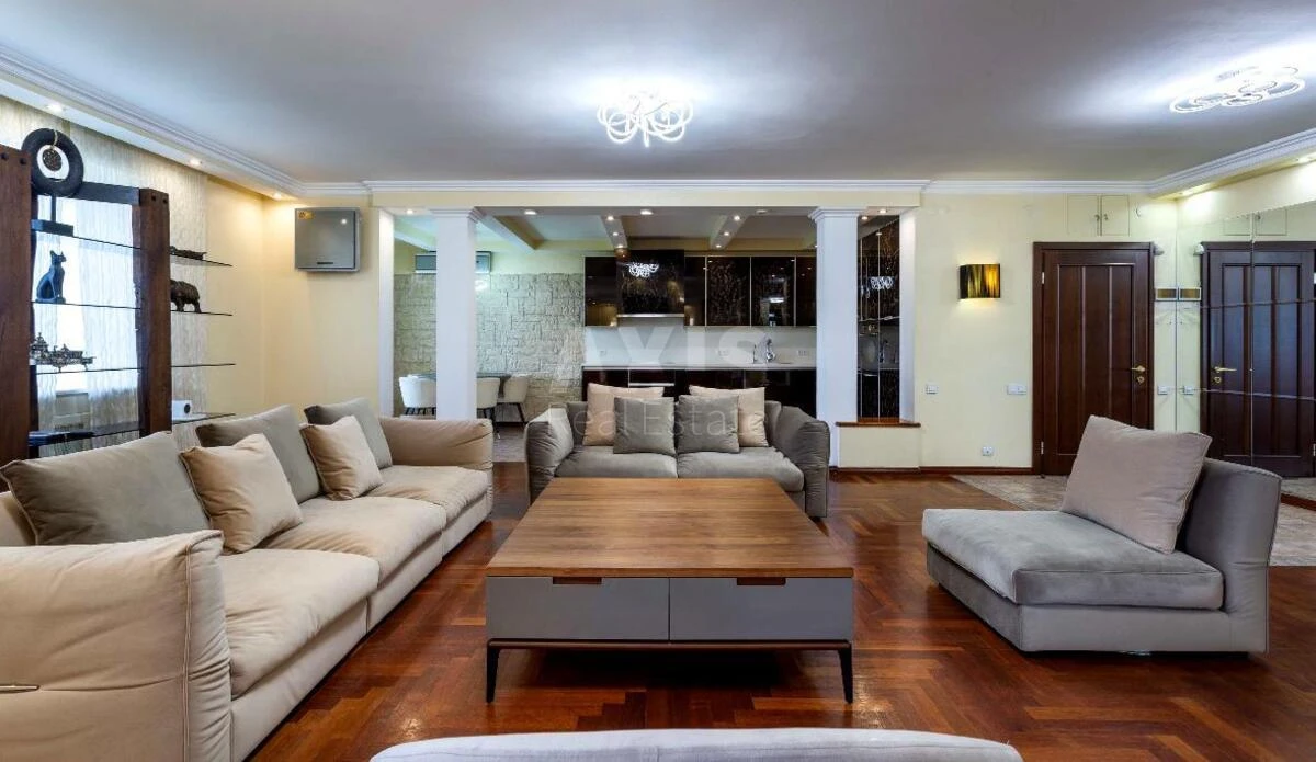 5 кімнатна квартира. Квартира повністю готова для проживання, мебльована, оснащена всією необхідною побутовою технікою провідних виробників. 1 рівень: велика кухня (посудомийна машина, двокамерний холодильник, духова шафа та микрохвильова піч Smeg), простора вітальня, 2 спальні, санвузол, гардероб; 2 рівень: спальня та велика спальня-дитяча з власним гардеробом та гральною зоною, санвузол з джакузі та душевею кабіною, лоджія; 3 рівень: спальня master-bedroom, 60 кв.м., з власним санвузлом, сауною та гардеробом. В кожній кімнаті встановлені кондиціонери, плазмені телевізори, багаторівневе освітлення, в квартирі є сигналізація.
