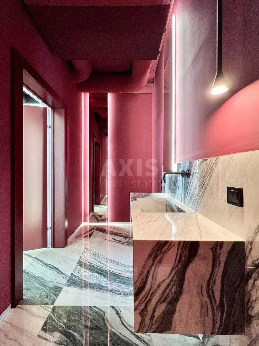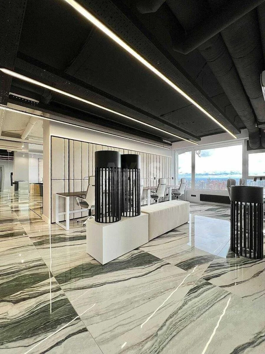 Офісне приміщення. 37 робочих місць. Рецепція. Кабінет керівника. Переговорна кімната. Skype room. Велика кухня зі столовою зоною. 2 санвузли. Гардеробна кімната. Встановлений генератор. Панорамний вид на Київ.