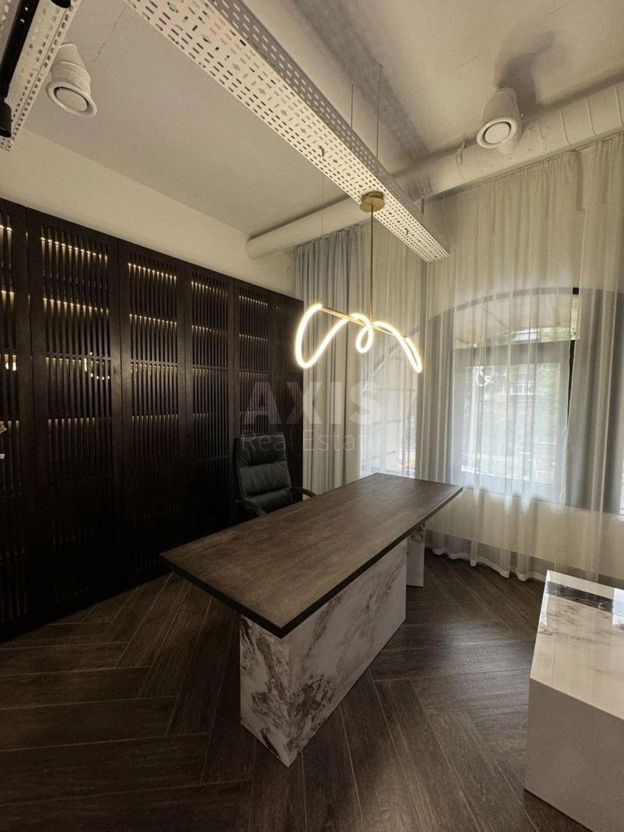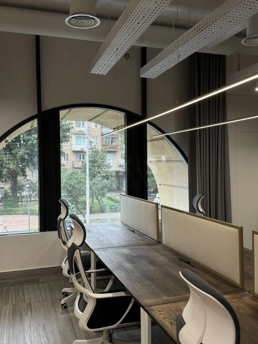 ЖК Ярославов Град, офісне приміщення. Офіс розрахований на комфортну та продуктивну роботу команди, поєднуючи стиль, функціональність та ергономіку. У офісі виконане зручне планування: робоча зона open-space, кабінет керівника, кабінет на 8 робочих місць, кухня, санвузол. Офіс має сучасний дизайнерський ремонт із використанням якісних матеріалів. Великі панорамні вікна та високі стелі створюють відчуття простору й наповнюють приміщення природним світлом.