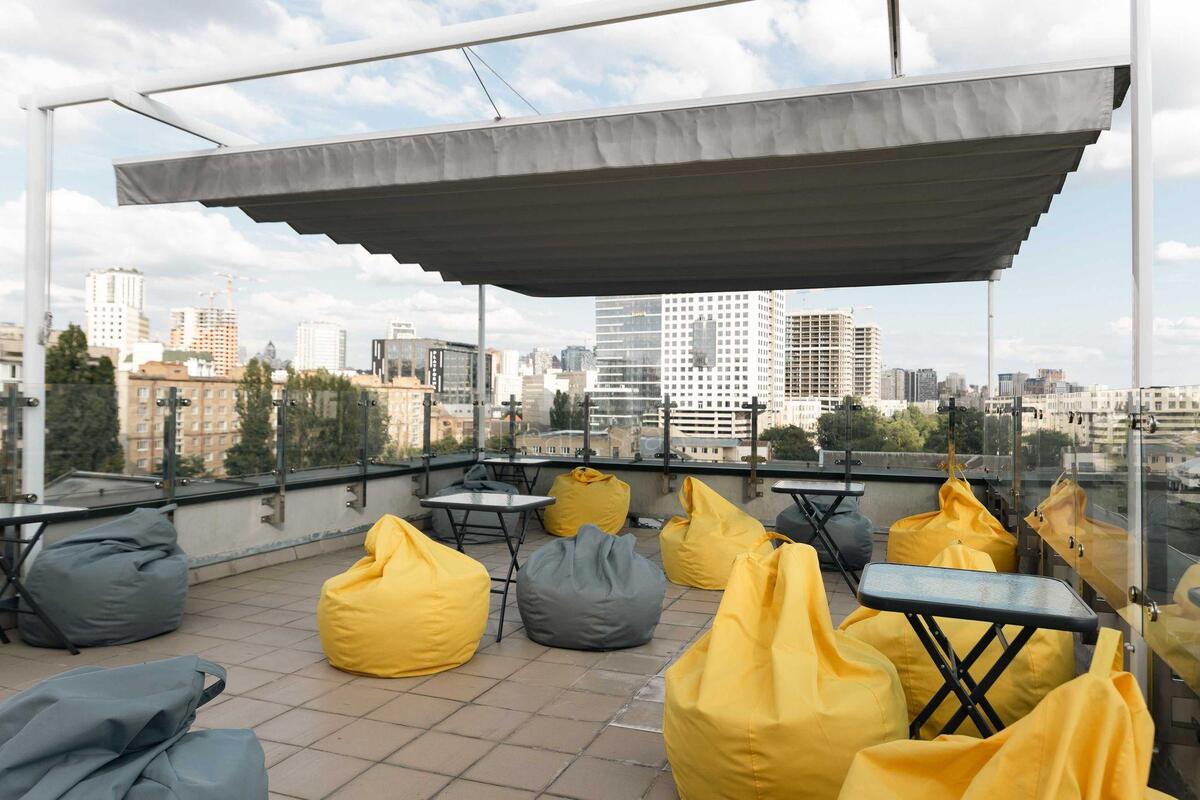 Офісне приміщення. Планування: окремий кабінет або переговорна, опенсайс на 8-10 людей, балкон, вихід на терасу. На території бізнес парку — трирівневий критий паркінг на 450 місць, 4 точки харчування, внутрішній двір із зоною відпочинку, 2 тераси, салон краси, арт-студія, конференц-зал, а також паркування з електрозарядками для самокатів та велосипедів.