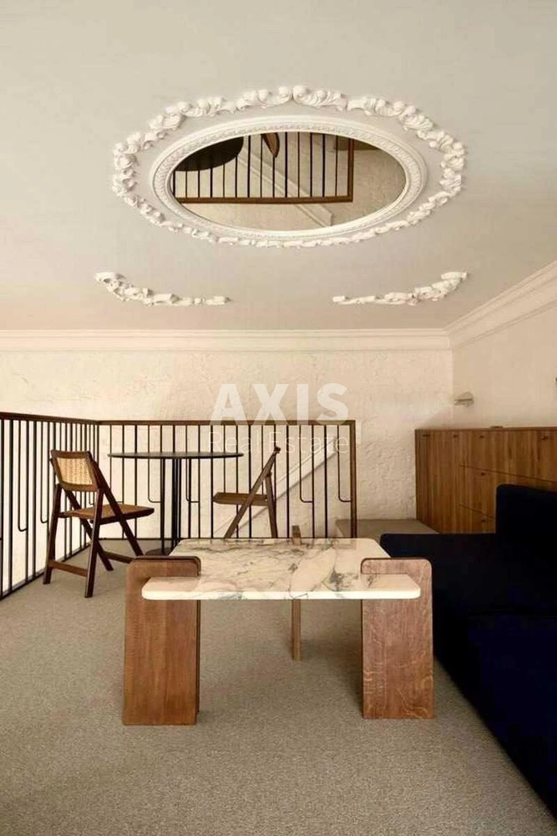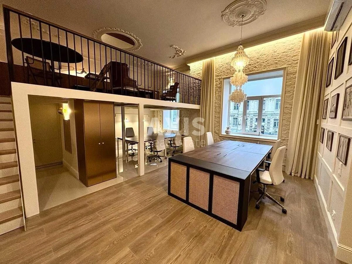 Офісне приміщення. Приміщення дуже стилізоване та функціональне, підходить як для офісу, творчої студії чи коворкінгу. Поєднання класичних деталей зі строгими сучасними формами виглядає гармонійно та атмосферно. Дизайн простору натхнений творчістю Йосифа Зецхера й підтримує зовнішній архітектурний ансамбль вулиці.