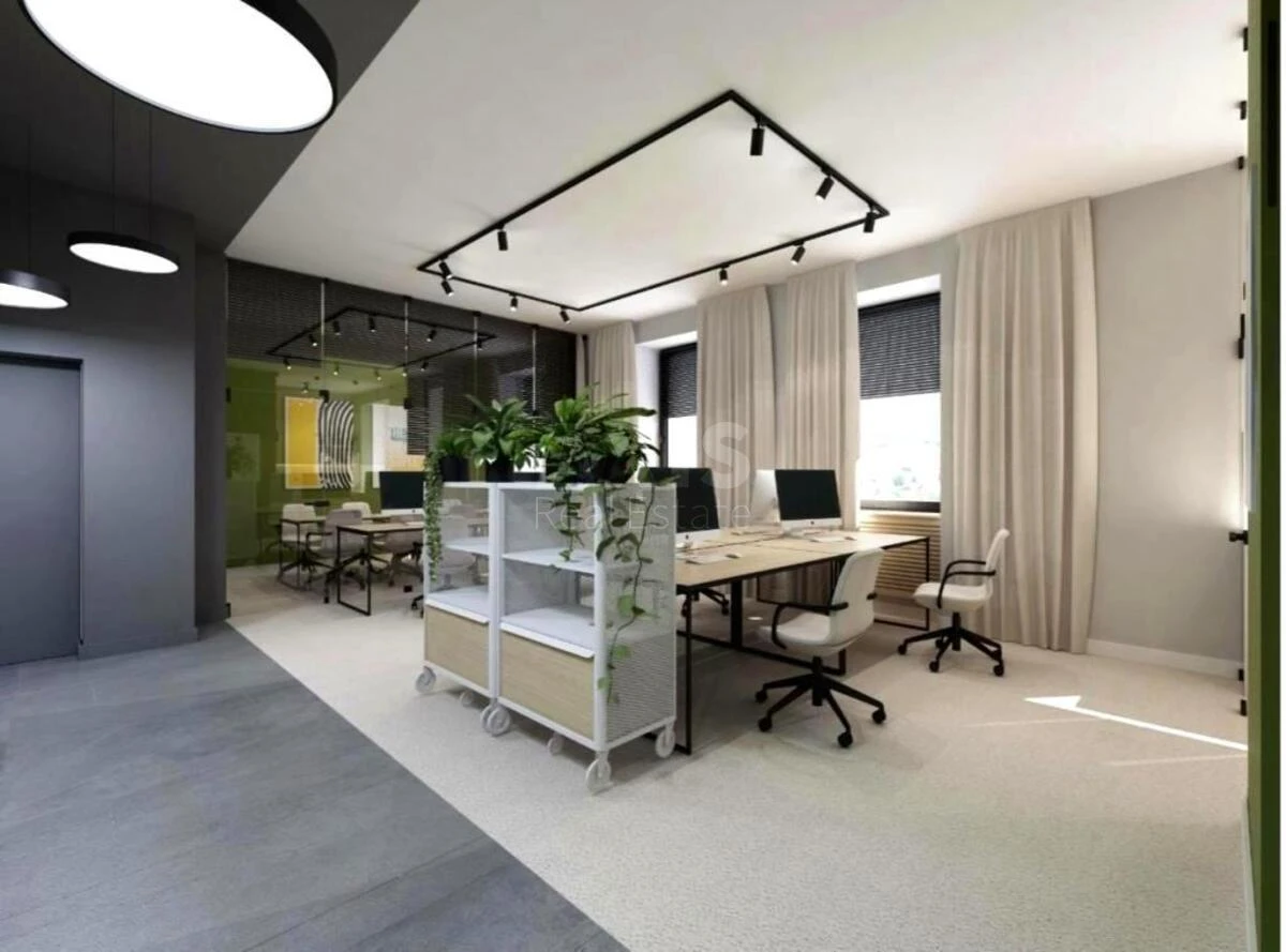 Офісне приміщення. Планування: простора зона open space. Кабінет директора. Кімната для переговорів. Кухонна зона. Санвузол. Вхід через підʼїзд, вікна виходять у внутрішній двір. Розрахований на комфортну роботу. Друга лінія від дороги, тихе подвір’я з вільною парковкою (без закріплених місць).