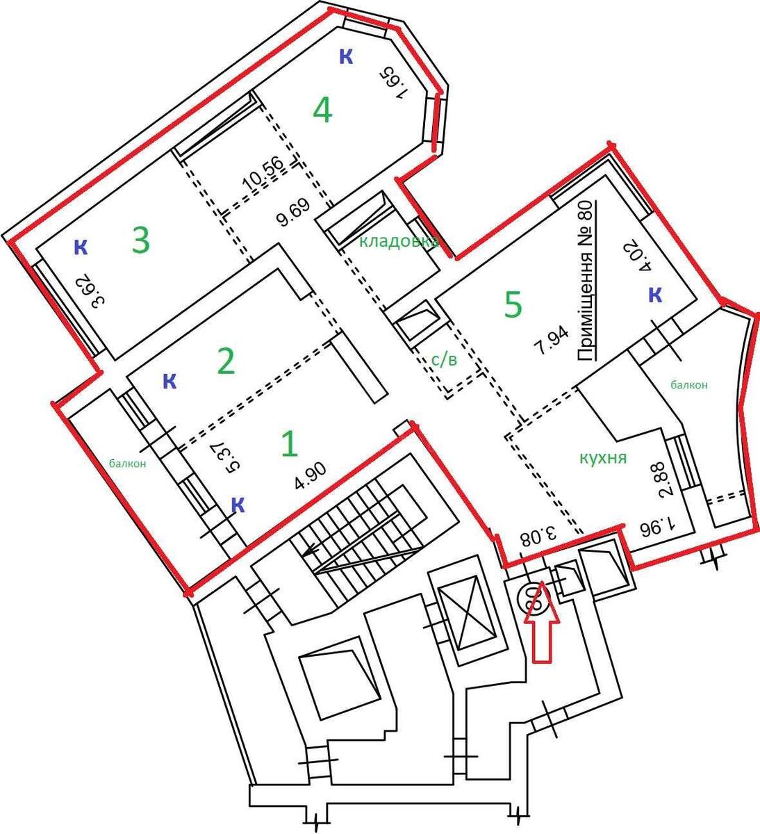 Офісне приміщення. Під ремонт (надаємо канікули). Планування: 5 кабінетів, кухня, с/в, ванна, кладова. Встановлено 5 кондиціонерів. Презентабельна вхідна група. Автономність: працює генератор на всю будівлю. Наземний паркінг у дворі на 80 авто (за окрему плату).